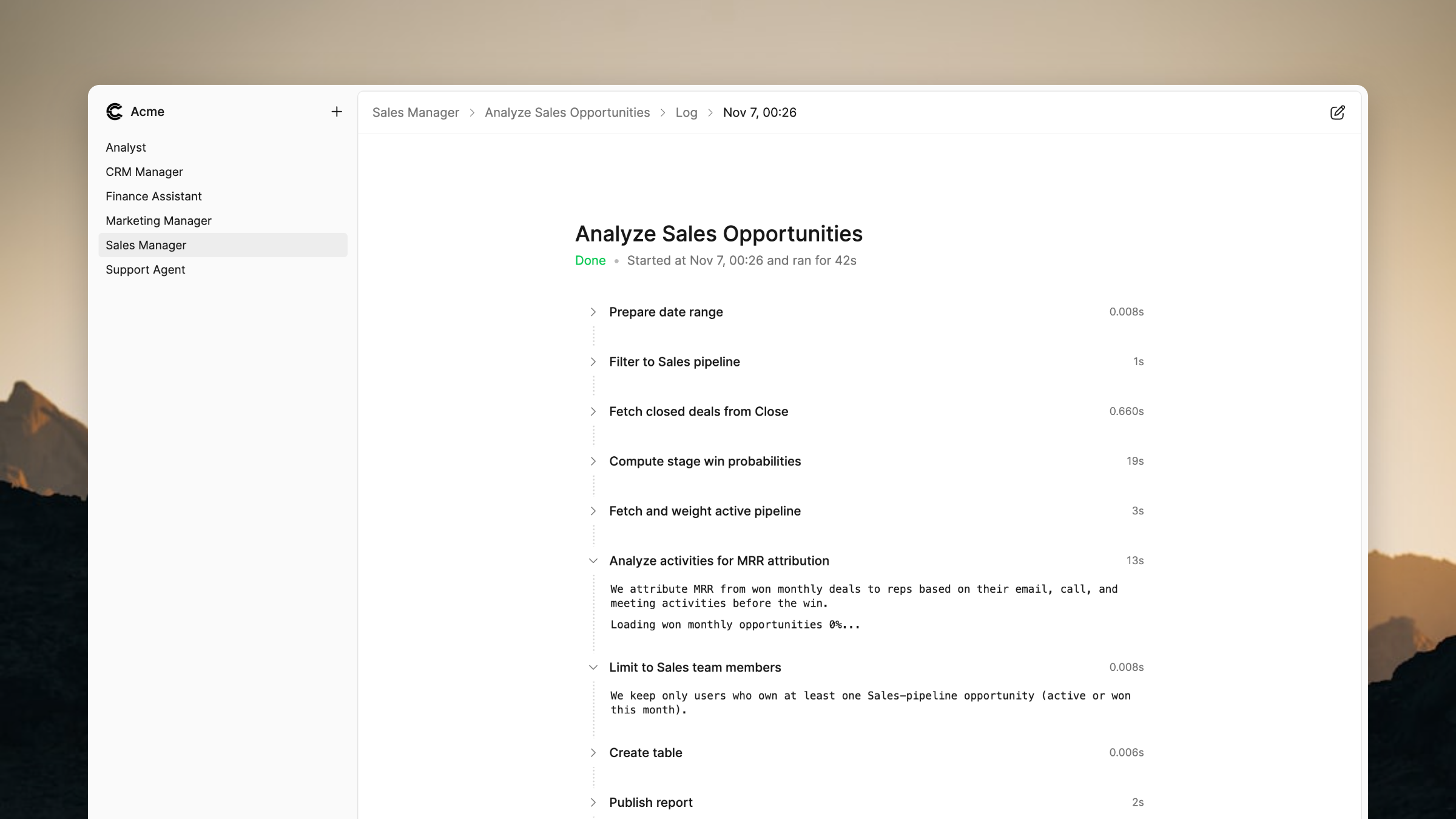 Build custom AI agents that do the work your team shouldn't have to do. They work in your systems, following your processes, just like a remote team member would do.